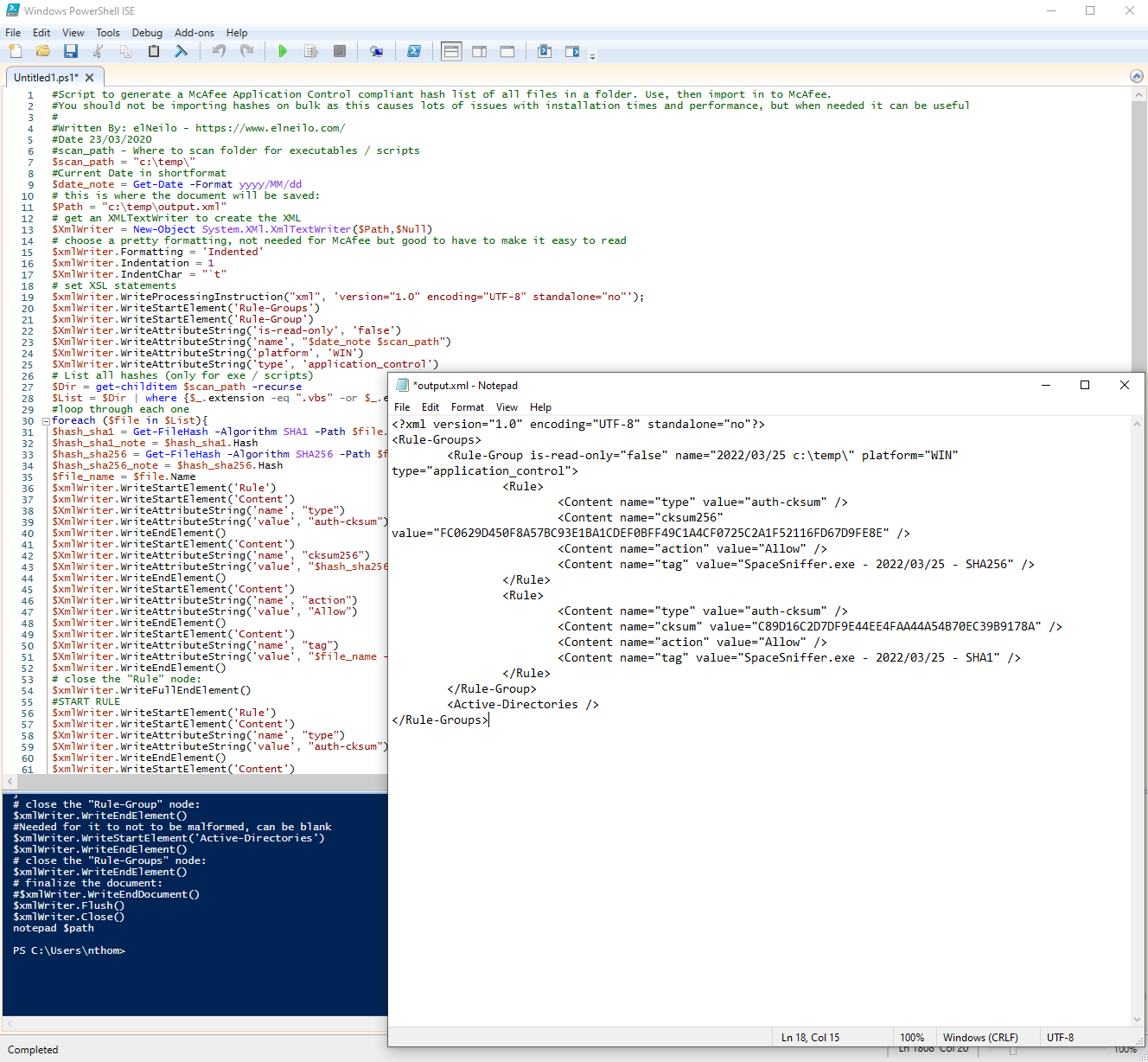 #Script to generate a McAfee Application Control compliant hash list of all files in a folder. Use, then import in to McAfee.#You should not be importing hashes on bulk as this causes lots of issues with installation times and performance, but when needed it can be useful##Written By: elNeilo - https://www.elneilo.com/#Date 23/03/2020#scan_path - Where to scan folder for executables / scripts$scan_path = \\server\share\path\folder#Current Date in shortformat$date_note = Get-Date -Format yyyy/MM/dd# this is where the document will be saved:$Path = "C:\output.xml"# get an XMLTextWriter to create the XML